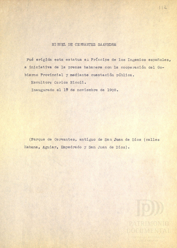 Mecanuscrito. Breve explicación de la estatua de Cervantes que se encuentra en el Parque de San Juan de Dios.