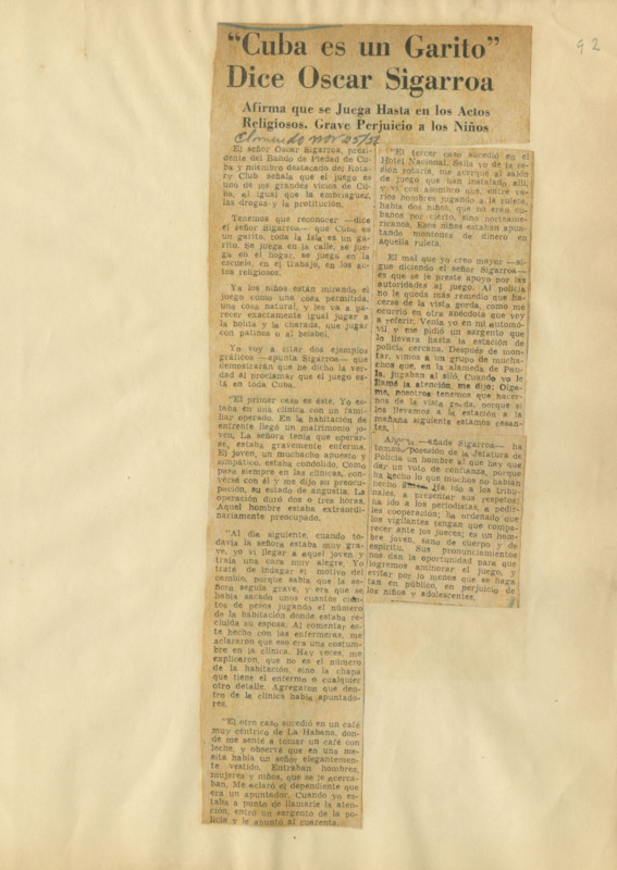 "Cuba es un garito" dice Oscar Sigarroa : afirma que se juega hasta en los actos religiosos : grave prejuicio a los niños.