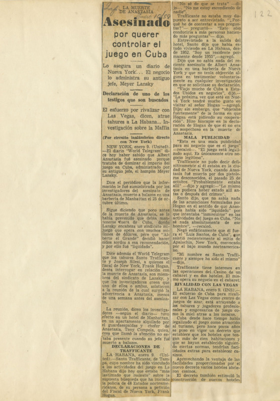 La Muerte de Anastasia : asesinado por querer controlar el juego en Cuba : lo asegura un diario de Nueva York…