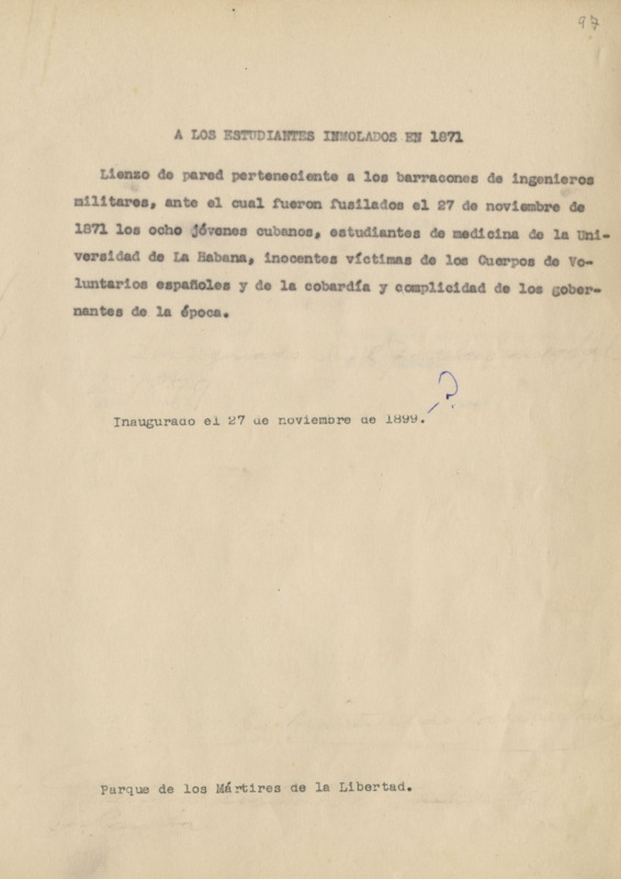 Mecanuscrito. Trata sobre un lienzo de pared perteneciente a los barracones de ingenieros ante el cual fueron fusilados los estudiantes de medicina.