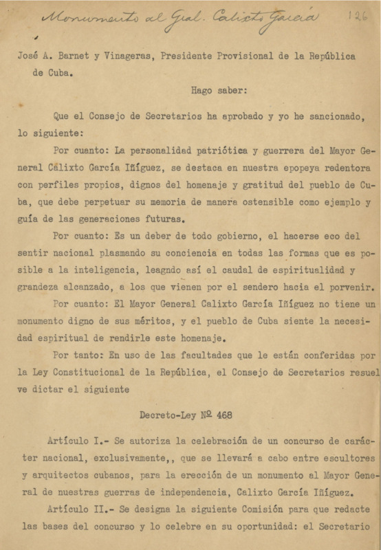 Se trata de la convocatoria a un concurso para edificar un monumento al mayor gral Calixto García.