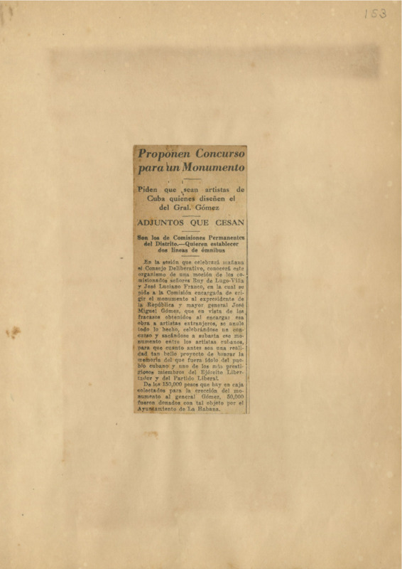 Proponen concurso para un monumento : piden que sean artistas de Cuba quienes diseñen el del Gral. Gómez : adjuntos que cesan…