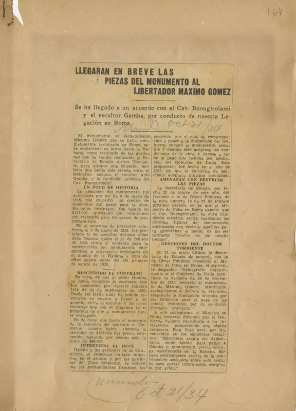 Llegarán en breve las piezas del monumento al libertador Máximo Gómez : se ha llegado a un acuerdo con el Cav. Buongirolami y el escultor Gamba, por conducto de nuestra legación en Roma.