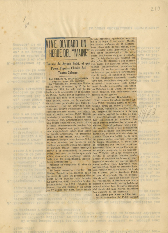 Vive olvidado un héroe del "Maine" : trátase de Arturo Feliú, el que fuera popular chinito del teatro cubano.