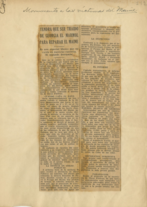 Tendrá que ser traído de Georgia el mármol para reparar El Maine : es uno especial blanco que no existe en nuestras canteras : el segundo derrumbe.