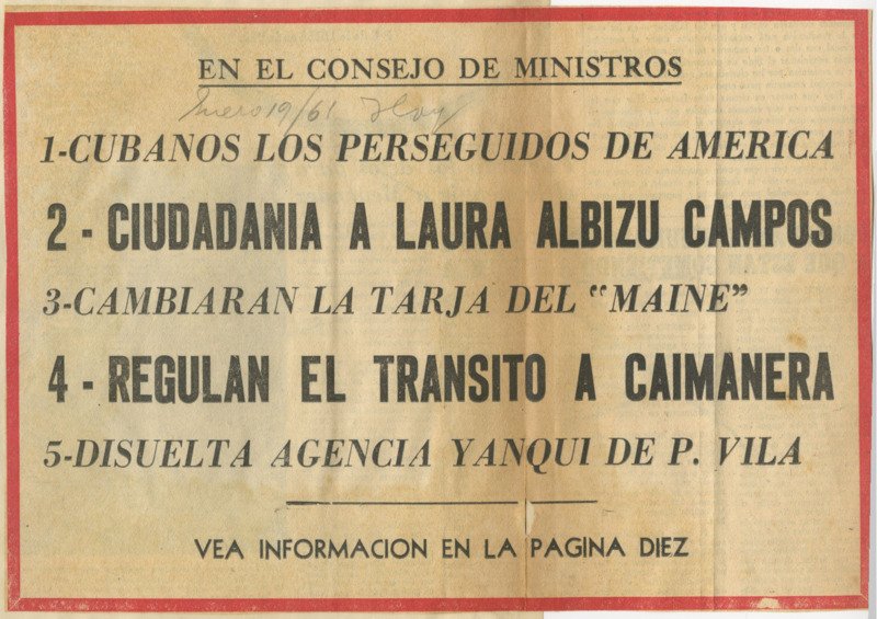 En el Consejo de ministros : Cubanos los perseguidos de América : ciudadanía a Laura Albizu Campos : Cambiarán la tarja del Maine : Regulan el tránsito a Caimanera : disuelta agencia yanqui de P. Vila. VeaINFORMACIÓN en la página diez.