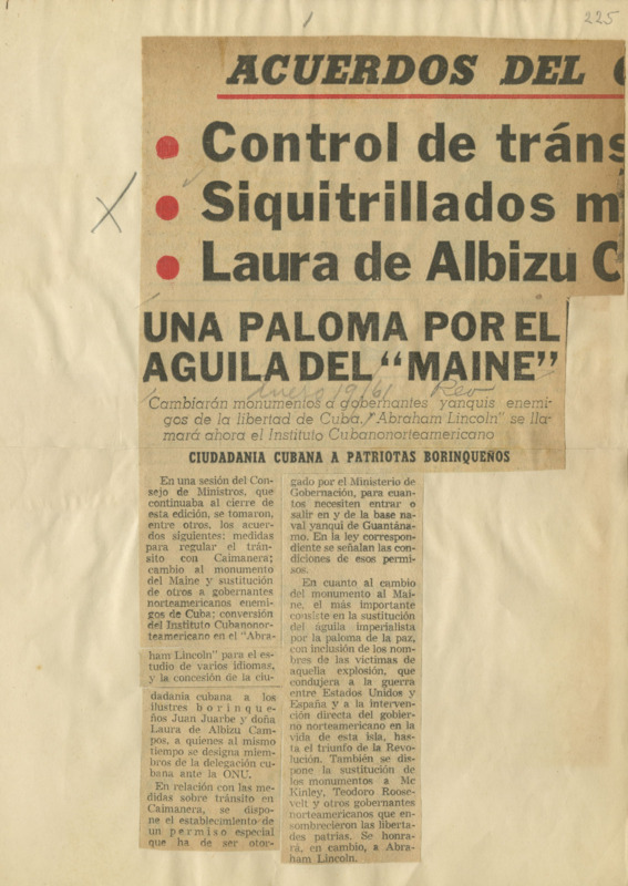 Acuerdos del Consejo de Ministros : control de tránsito crean en Caimanera : siquitrillados monumentos imperialistas : Laura de Albizu Campos y Juarbe a la ONU : una paloma por el águila del "Maine":