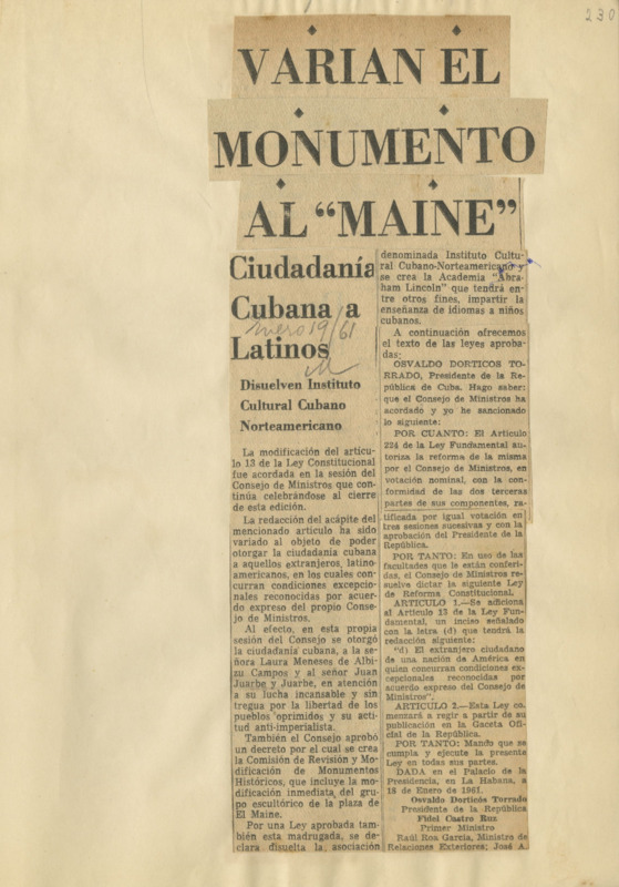 Varían el monumento al "Maine" : ciudadanía cubana a latinos : disuelven Instituto Cultural Cubano Norteamericano.