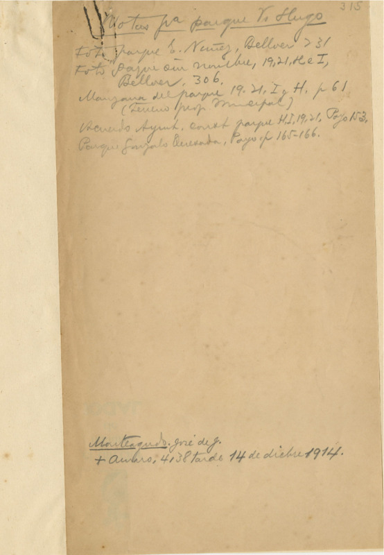 Notas manuscritas sobre dicho parque. Al pie de página, en otra nota manuscrita dice: José de J. Monteagudo, (?), 4.38 de la tarde, 14 de dic. de 1914.