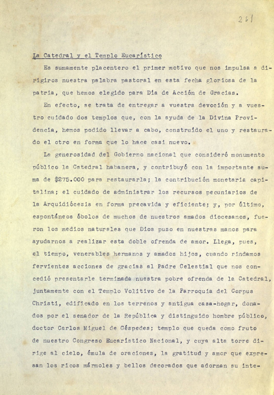 Fragmento de la Carta Pastoral dirigida por el Arzobispado de La Habana al Cabildo Metropolitano, Clero y fieles de la Arquidiócesis. Mecanuscrito.