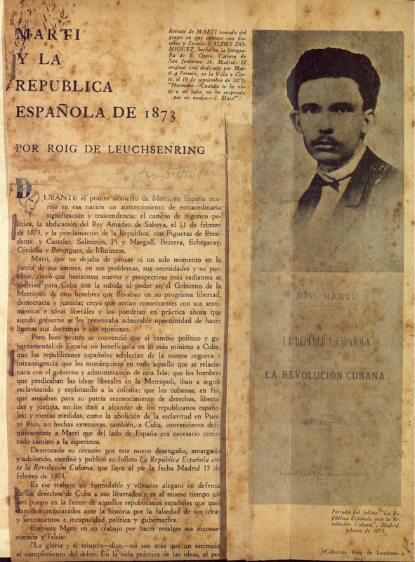Incluye fotografías : de José Martí, tomado del grupo en que aparece con Eusebio y Fermín Valdés Domínguez; portada del folleto "La República española ante la Revolución cubana", Madrid, feb.1873; la Universidad de Zaragoza, donde estudió Martí y un facsímil del recibo de matrícula firmado por Martí, cuando estudiaba en la Universidad de Madrid.
